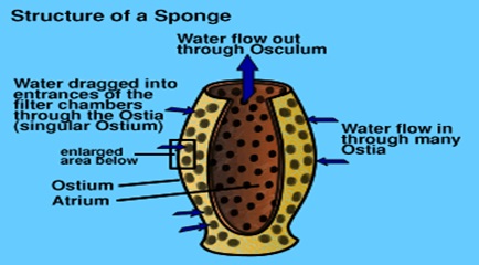 این جانوران ساده، دستگاهی برای گوارش غذا وبه طور کلّی دستگاهی در بدن ندارند. بر روی پوست سخت بدن اسفنج سوراخهایی وجود دارد که به طریق آنها آب به داخل اسفنج وارد میشود. این سوراخها را سلّولهایی به نام اسپیکول ساختهاست. درون سوراخها را سلّولهایی به نام یقهدار فرش کردهاند. این سلّولها باعث جریان آب در سوراخها میشوند. آبی که به وسیله این سوراخها و جریانها وارد بدن اسفنج میشود، حاوی مواد ریز غذایی و اکسیژن محلول درآب دریا است. وقتی سلّولهای یقهدار غذا را جذب خود کردند، آن را به سلّولهای آمیب شکل که سرگردان هستند تحویل میدهند. این سلّولهای آمیبی شکل همانطور که گفتیم سرگردان هستند.